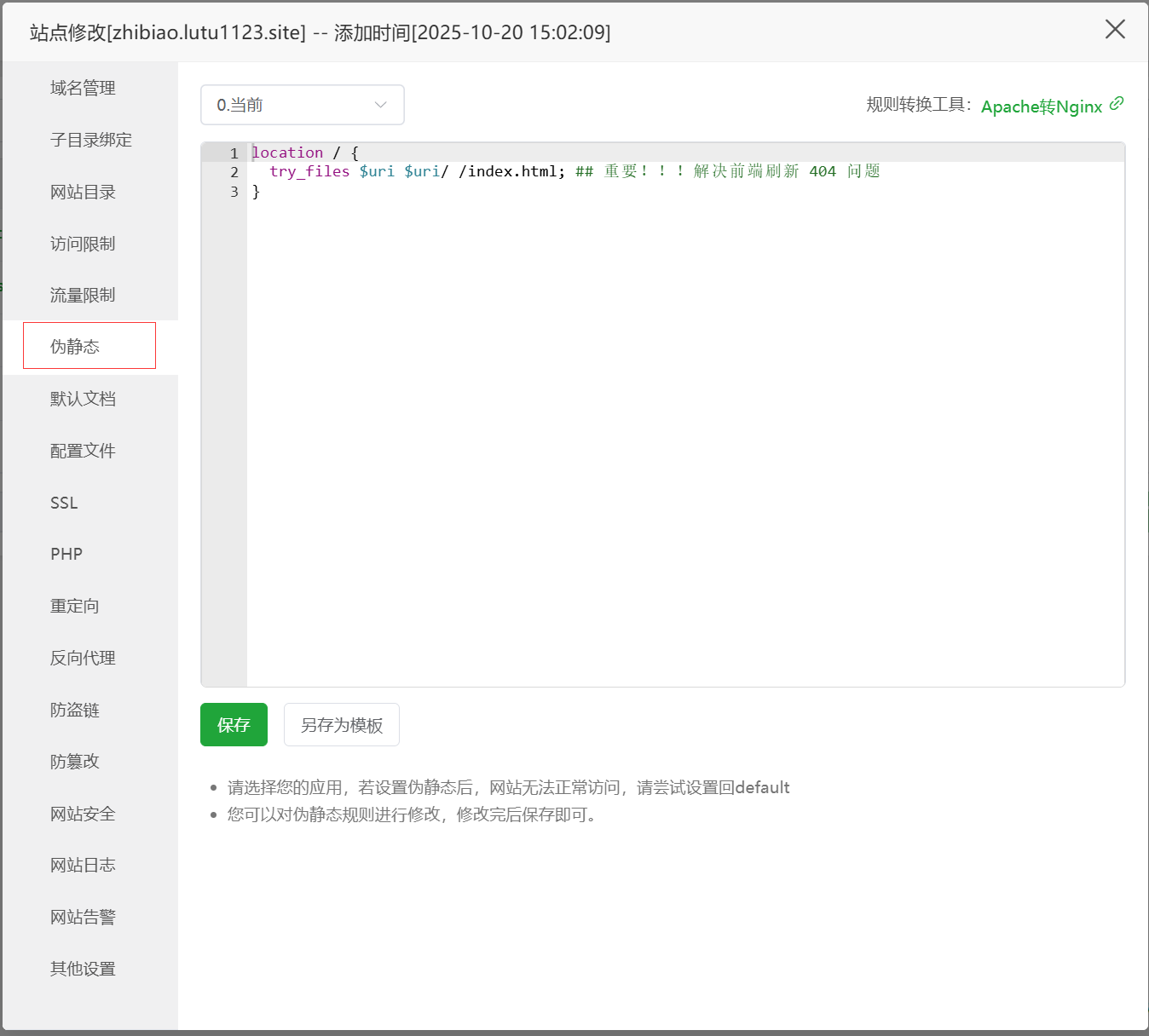 在网站目录中的运行目录选择你刚刚上传前端文件的文件夹,并保存